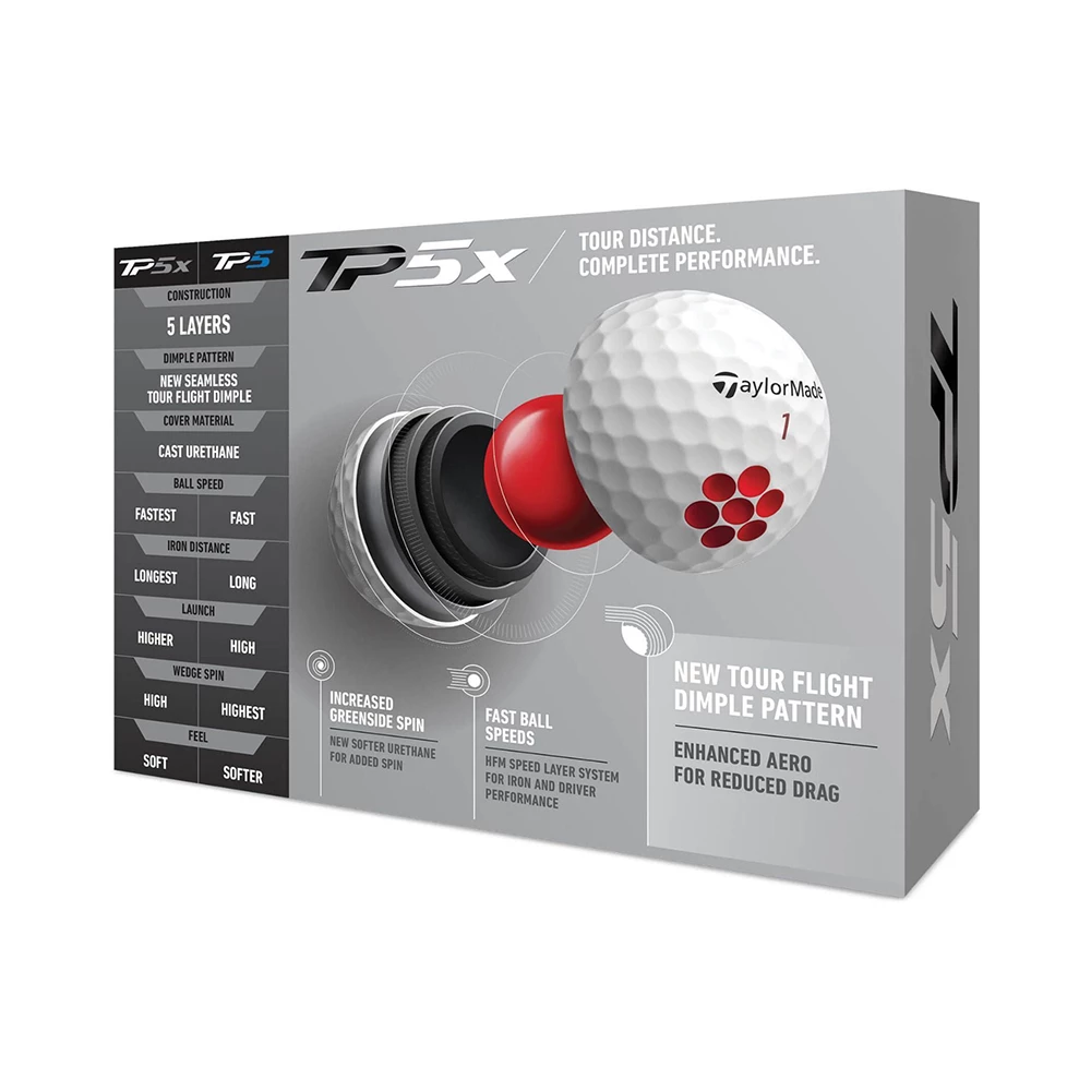 INCREASED AERODYNAMICS WITH NEW TOUR FLIGHT DIMPLE PATTERN. The all-new Tour Flight Dimple Pattern unlocks the next level of aerodynamics while still promoting maximum carry distances and a steep angle of descent for stopping power, especially on long irons. TOUR DISTANCE, COMPLETE PERFORMANCE. TP5x is our fastest and longest Tour ball, featuring a 5-layer design with four increasingly stiff layers enclosed in cast urethane. It delivers unmatched performance off the tee and on the approach, without sacrificing feel on the scoring shots. IMPROVED GREENSIDE SPIN & FEEL. While maintaining the formula that makes TP5x a leader in speed and distance, we�ve added a softer cast urethane cover for increased groove interaction on greenside shots for more spin and improved feel. THE PATH TO DISTANCE. The path to distance has evolved with the all-new TP5x. In 2017, a movement began with the optimal spin and launch conditions provided by our 5-layer construction. Then we increased ball speed with the HFM Speed Layer and now we�ve added advanced aerodynamics with the Tour Flight Dimple Pattern.